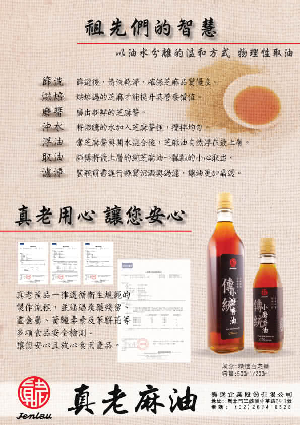 為了落實真老對食安的堅持,以及永續經營的信念, 從食材的把關、嚴謹製造過程的紀錄、成品的批次留樣檢驗,所有環節毫不馬虎,讓喜愛真老麻油的朋友們可以安心製作好料理!