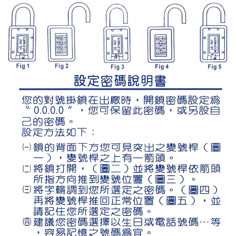 台灣製造,品質保證 密碼可自由設定、隨時更換流行時尚設計 銅鋅合金品質優良 |